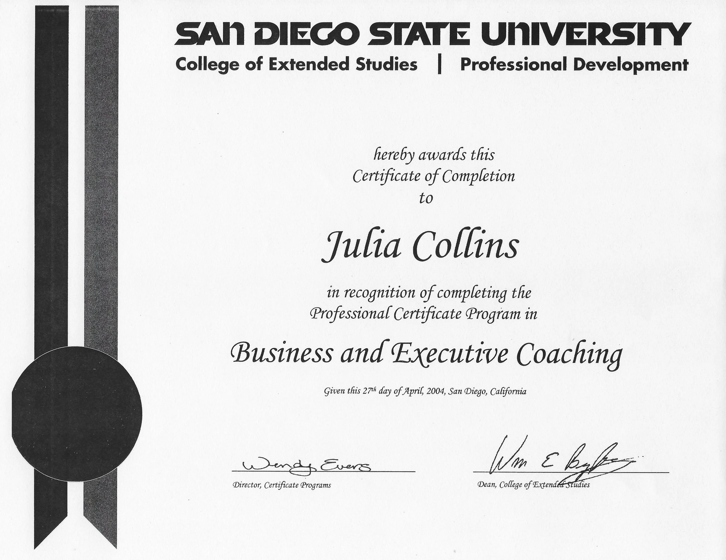 The Business and Executive Coaching certificate program at SDSU was a two-year curriculum focusing on leveraging one’s own experience to help others realize their full potential as an entrepreneur, manager, business leader. The certificate represents expertise in the fundamentals of coaching and organizational development, including how to analyze client needs and deliver meaningful results.